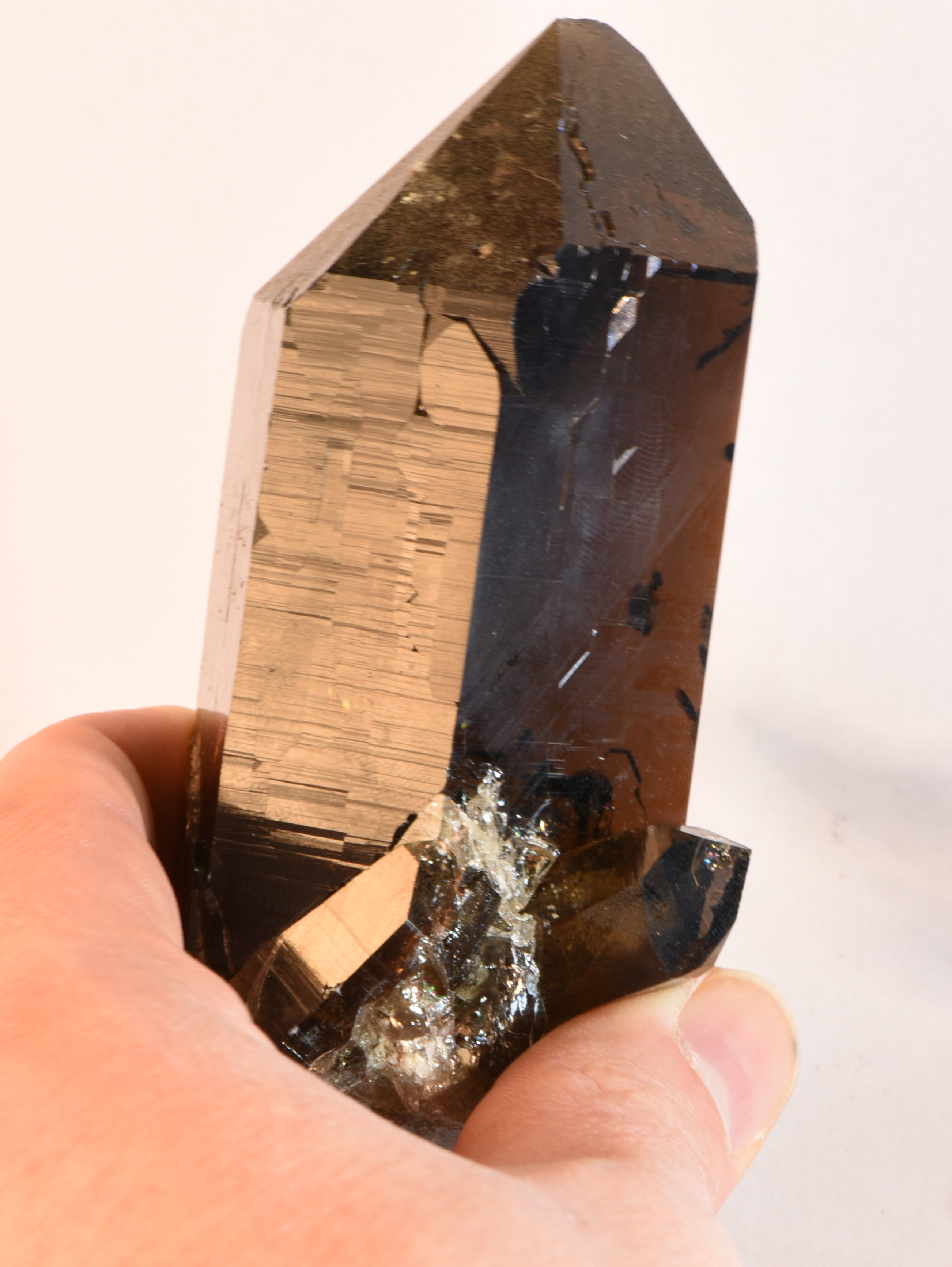 Diese dunkle Rauchquarzspitze hat eine Top-Schleifqualität. Am Fuß sitzt noch ein weiterer kleiner Rauchquarz, der die Schönheit des Einzelspitzes nochmal unterstreicht.