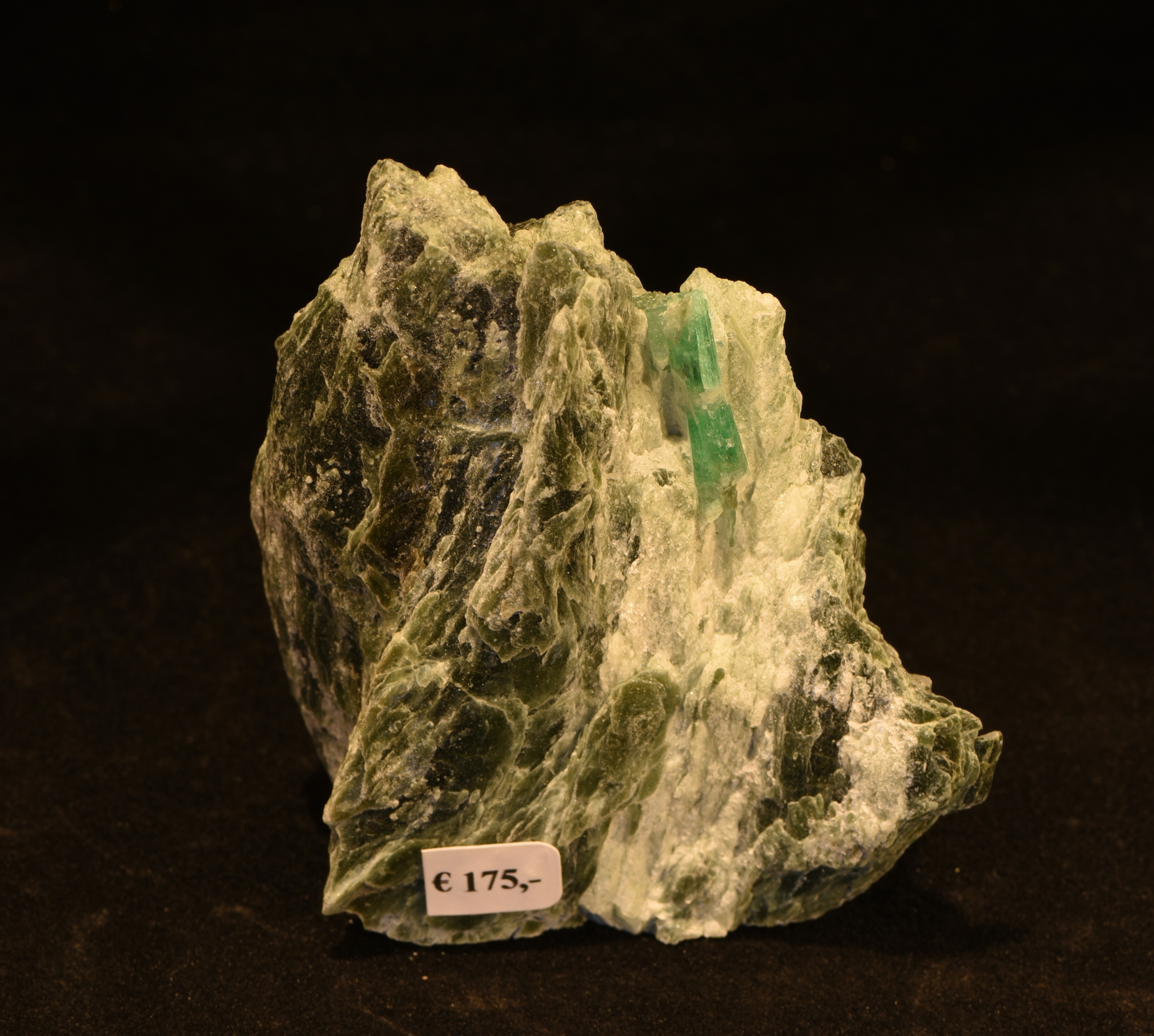 Auf dieser 8 cm hohen Stufe sitzt eine 2 cm lange Smaragd-Verwachsung mit guter Qualität. Die Stufe ist unten flach, wodurch sie sich perfekt hinstellen lässt.