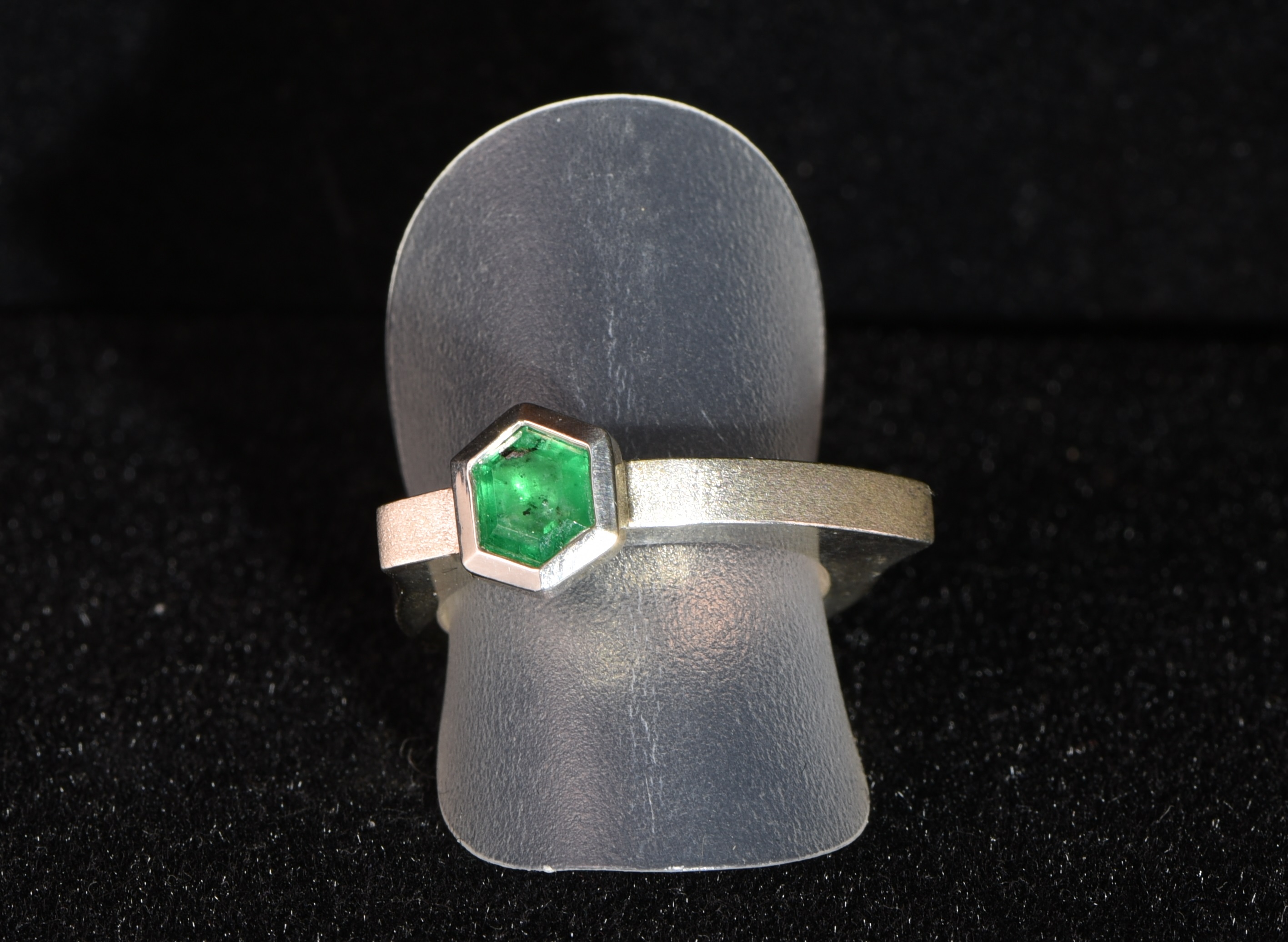 A 5 mm x 5 mm large, faceted emerald was set into a silver ring. The emerald was found at the emerald-mine in "Habach"-valley (Bramberg, Salzburg, Österreich).