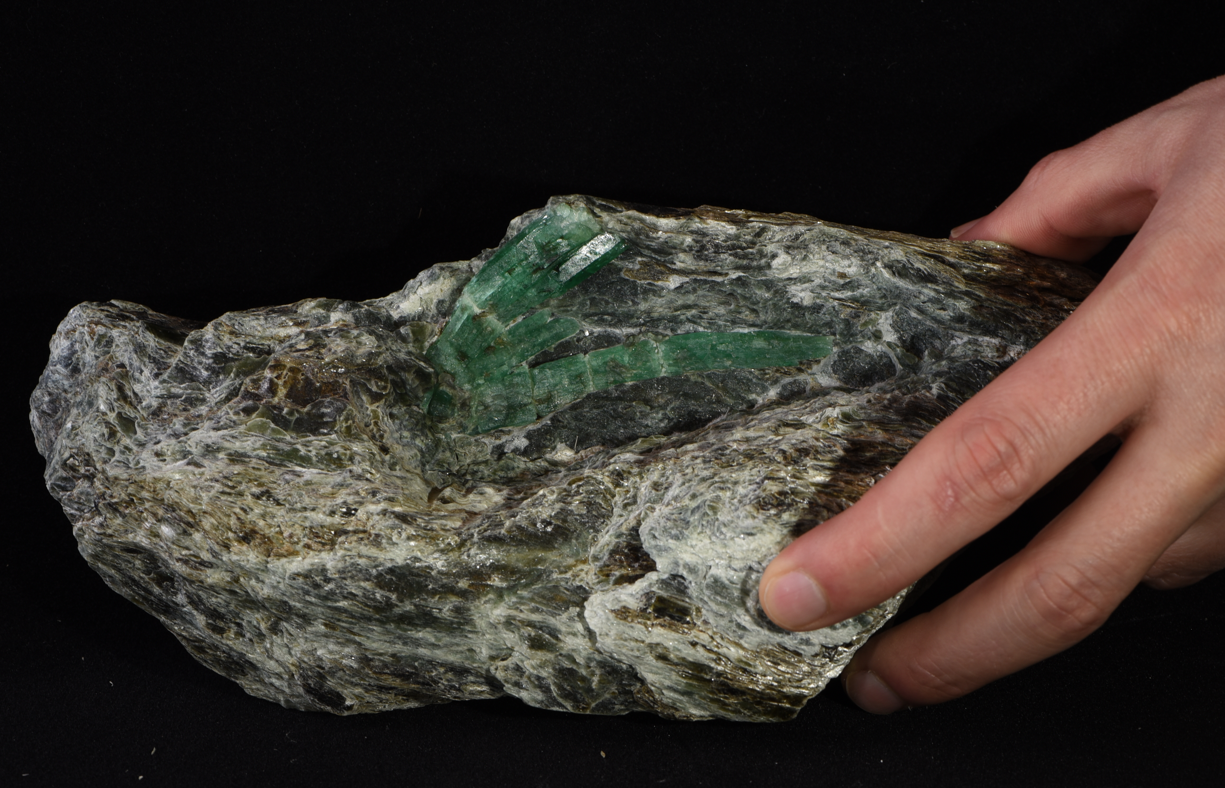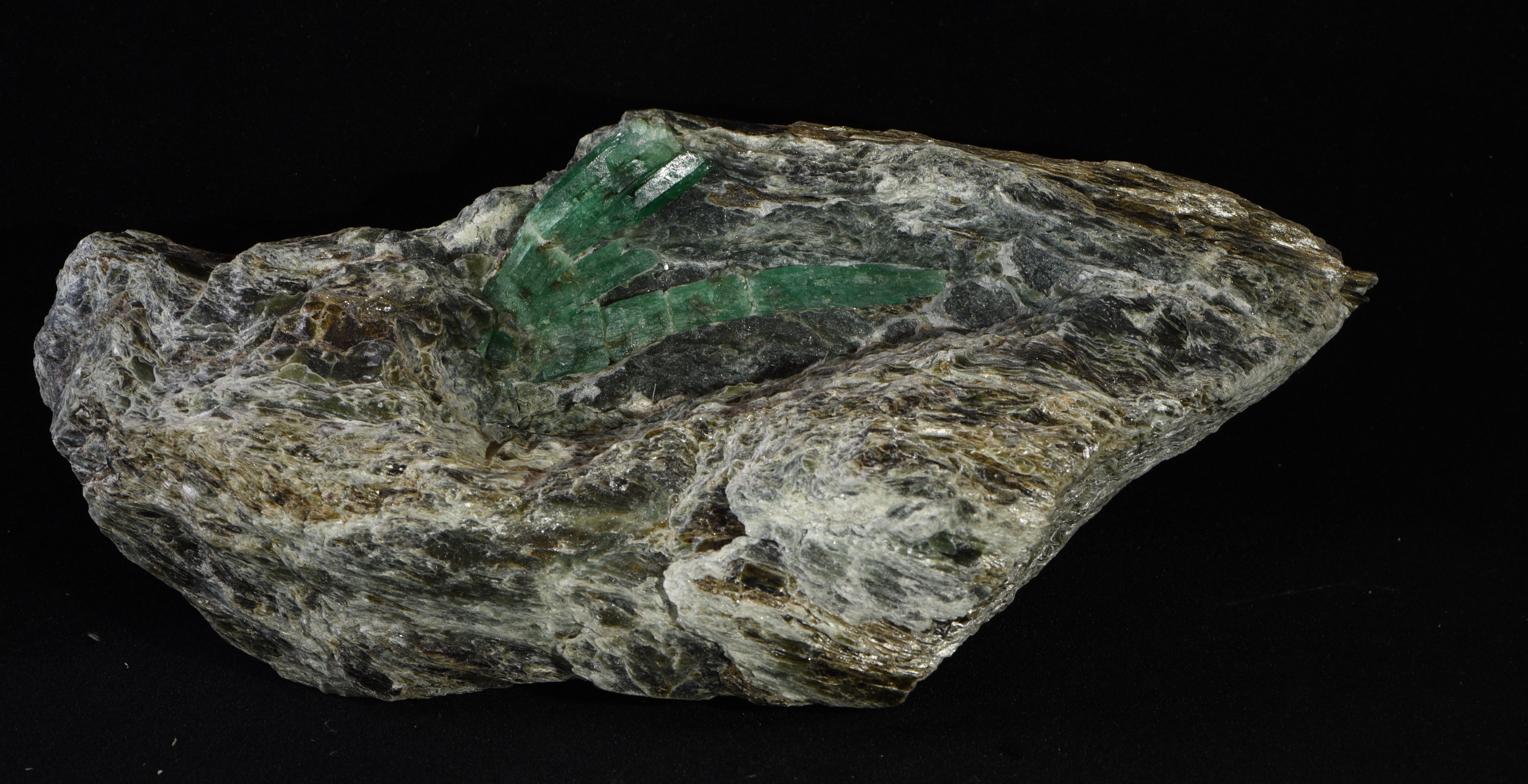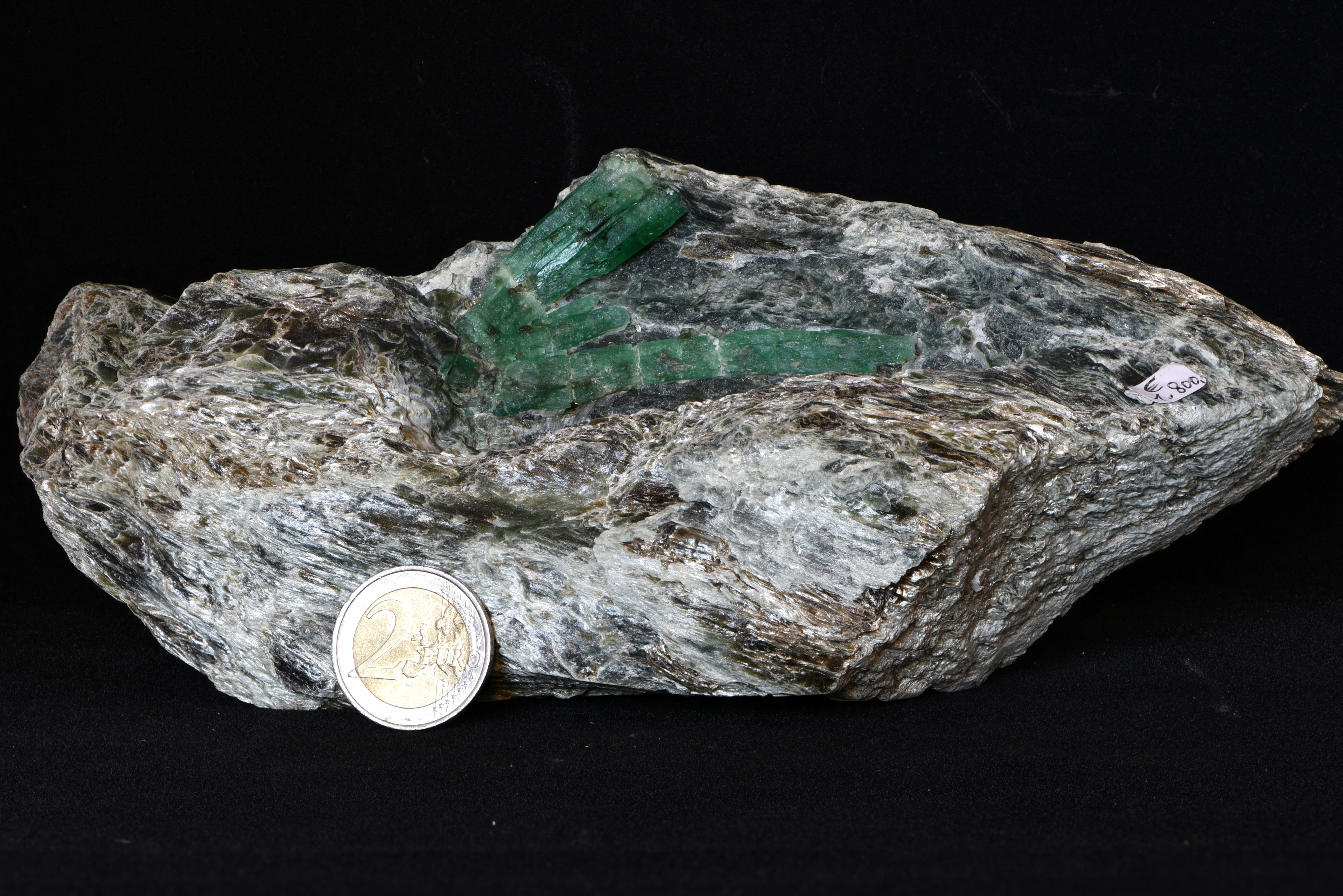 A 7.5 cm long "emerald vain" is sitting on biotit mica slate. The emerald was found in the emerald mine in the Habach Valley (Bramberg, Salzburg, Austria).