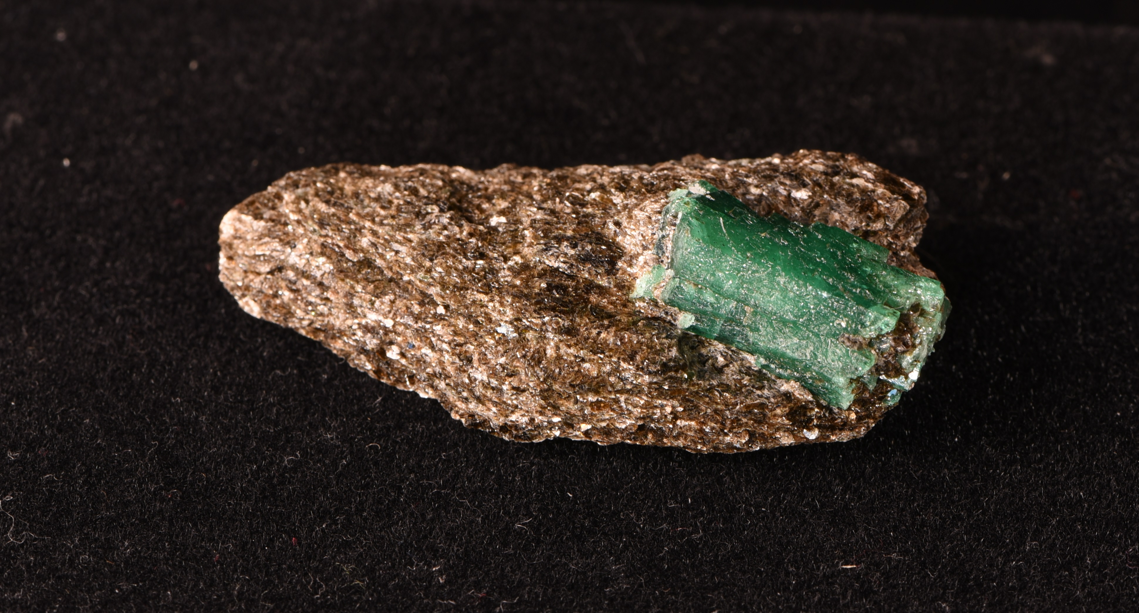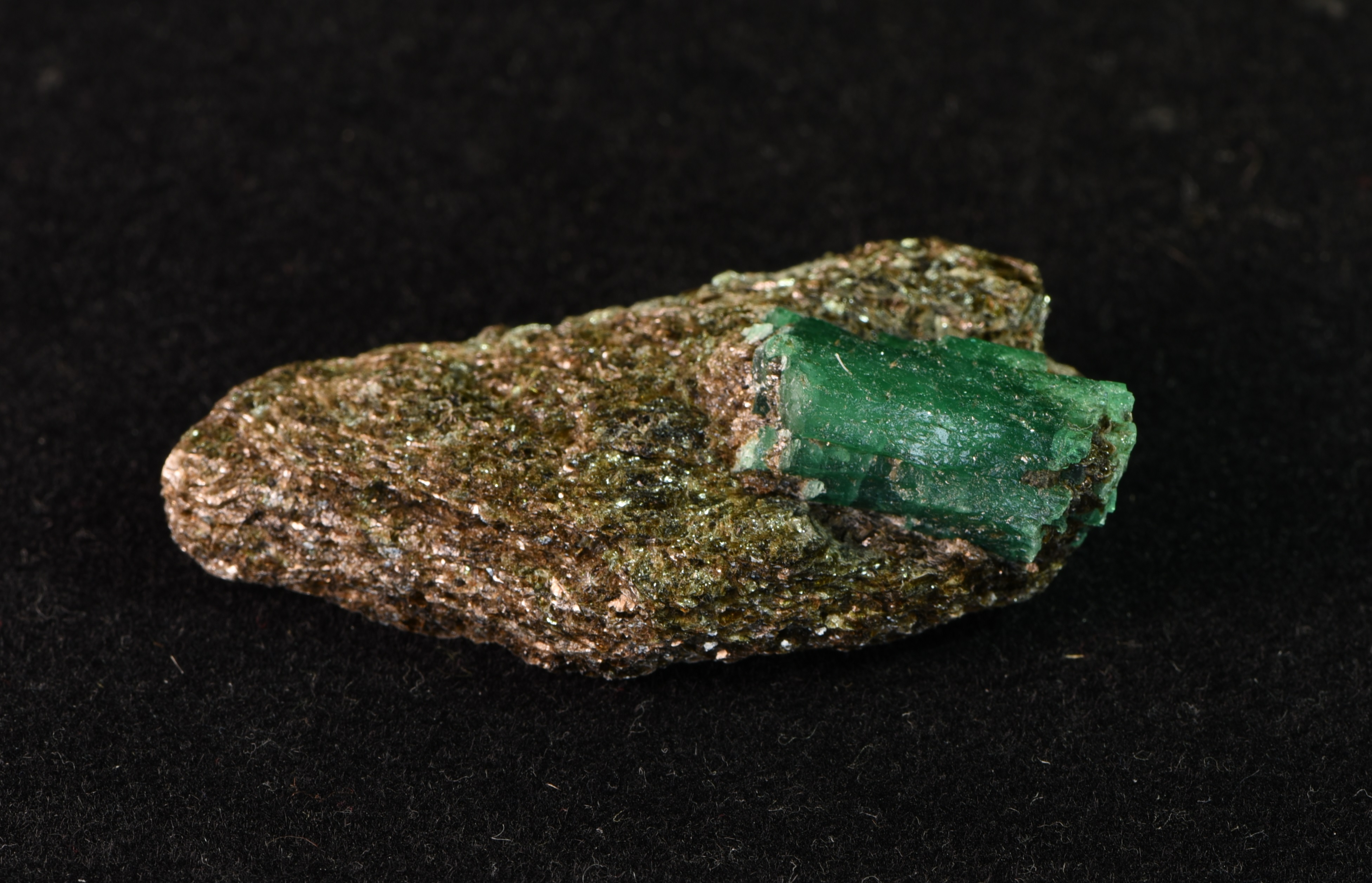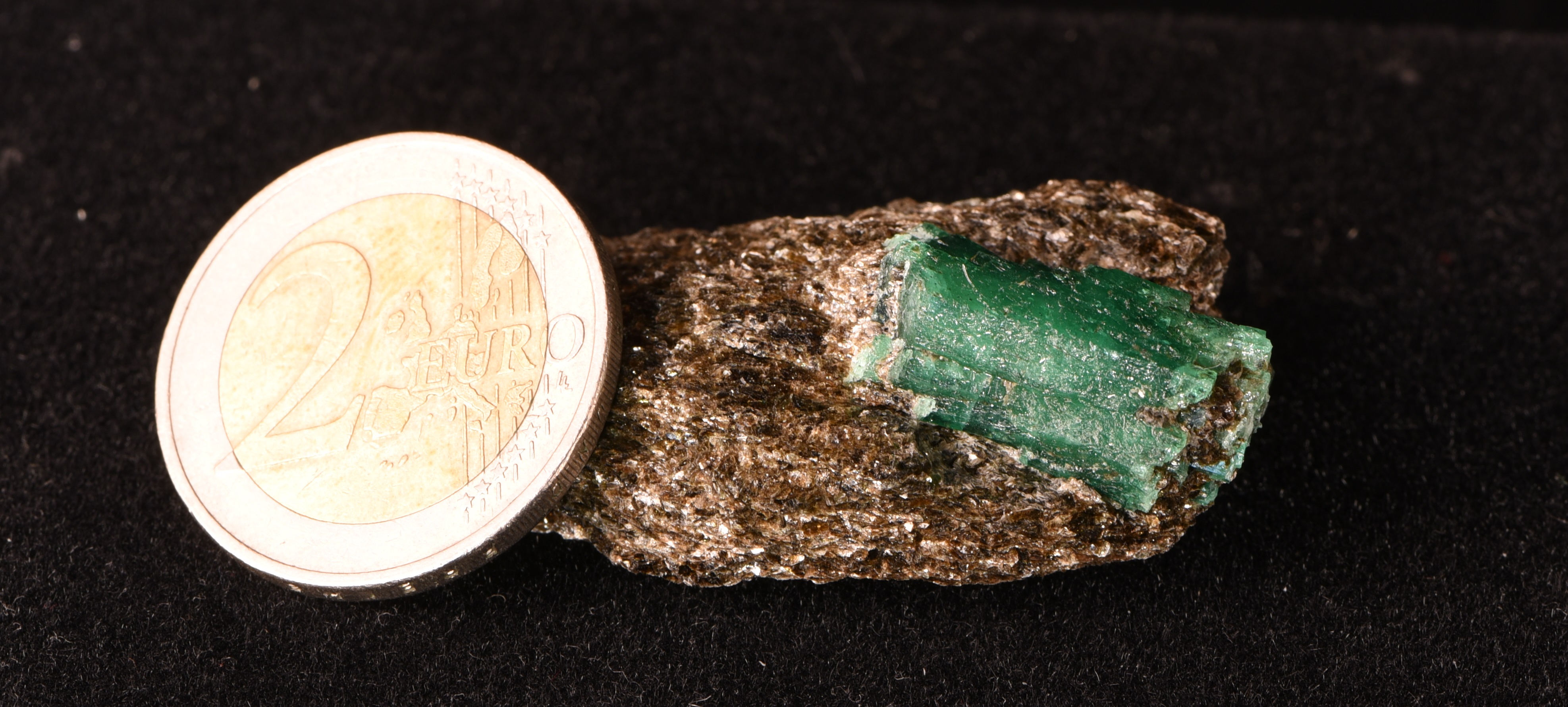Auf dieser kleinen aber feinen Stufe sitzt ein 2 cm (!) langer und 1,3 cm dicker Smaragd. Die Farbe ist tiefgrün und das umliegende Muttergestein glänzt wie Silber. Ein Kristall mit dieser Größe aus dem Habachtal ist eine Seltenheit!