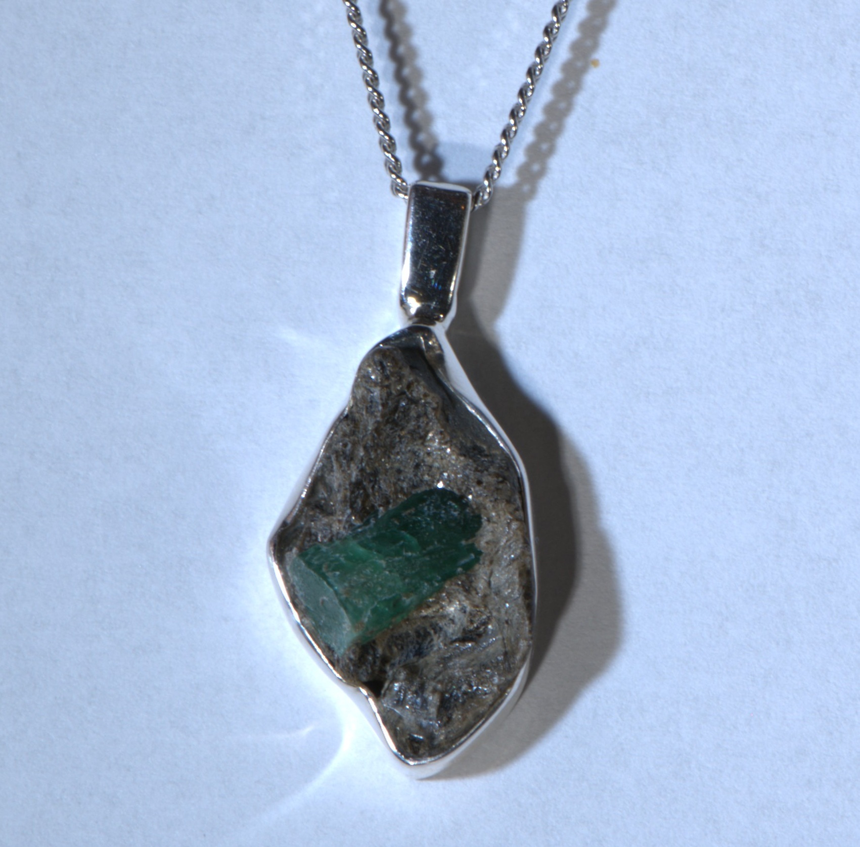 Der Smaragd misst 8 mm und sitzt noch mitten im Muttergestein (Biotit-Glimmerschiefer). Der Stein wurde im Smaragdbergbau im Habachtal (Bramberg, Salzburg, Österreich) gefunden und in Silber eingefasst (Randfassung mit einer hinten geschlossenen Silberplatte).