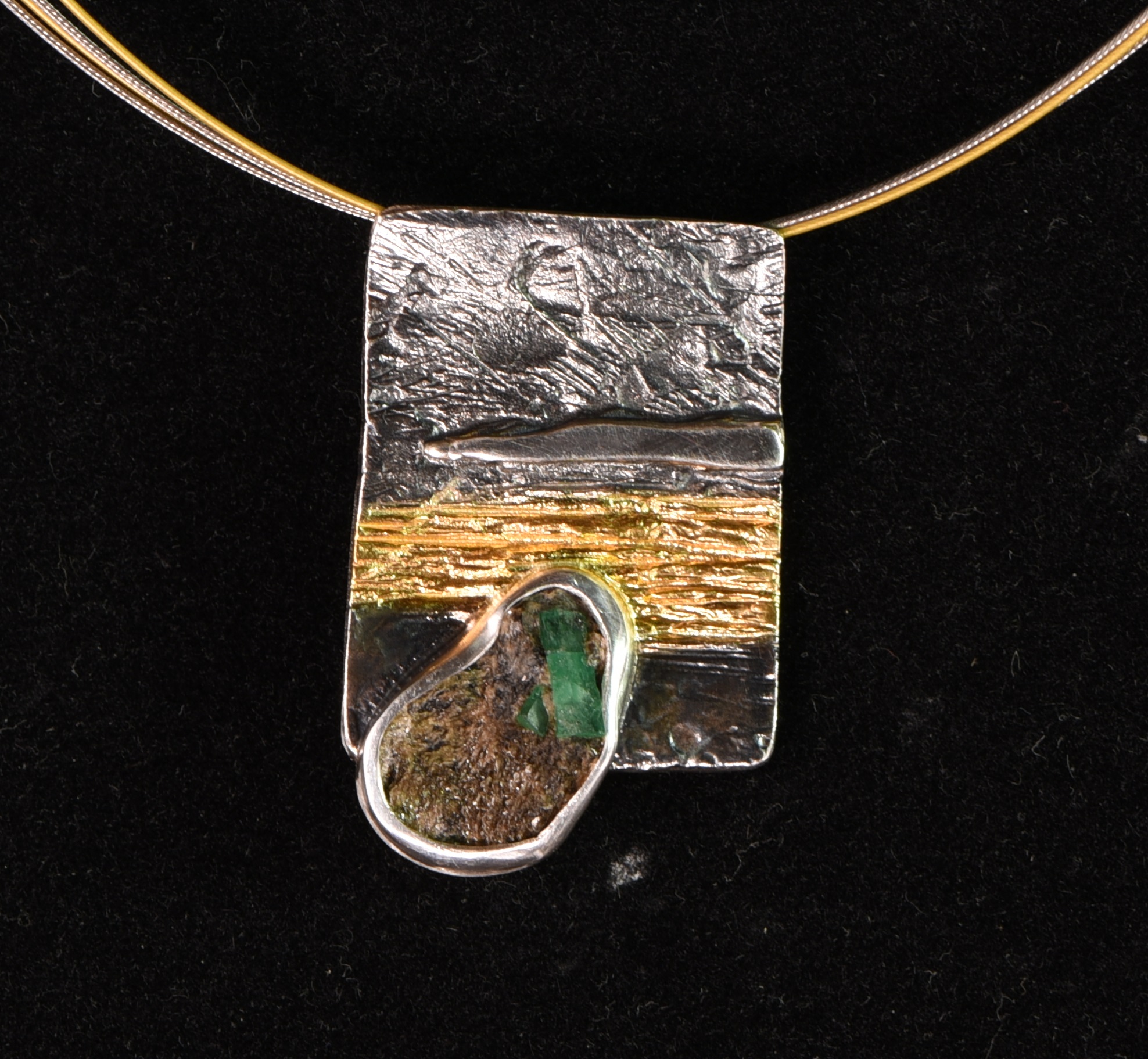 Dieser 7 mm lange Smaragd befindet sich noch im Muttergestein - der Stein hat eine ausgezeichnete Transparenz und eine sehr gute, tiefgrüne Farbe. Die außergewöhnliche Fassung unterstreicht die Besonderheit des Smaragdes. Der Smaragd wurde im Smaragdbergbau im Habachtal (Bramberg, Salzburg, Österreich) gefunden und in Silber eingefasst. Das Silber ist teilweise geschwärzt und vergoldet.
