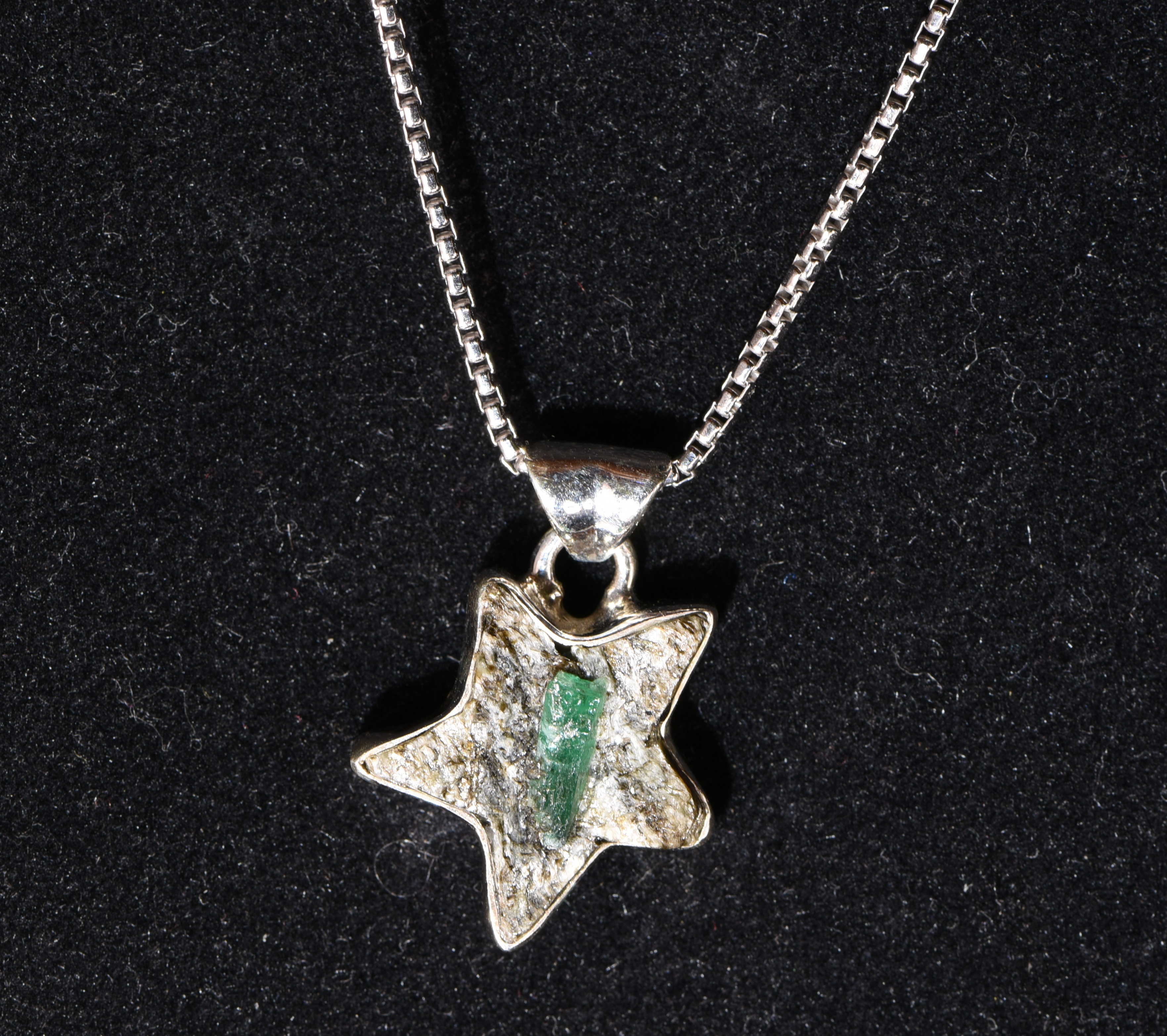Der 9 mm x 4 mm große, naturbelassene Smaragd hat eine sehr schöne, tiefgrüne Farbe und sitzt im Muttergestein. Der Stein ist in Silber eingefasst (Randfassung, hinten geschlossen). Der Smaragd wurde im Smaragdbergbau im Habachtal (Bramberg, Salzburg, Österreich) gefunden.