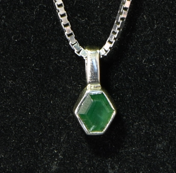 Der 5 mm x 5 mm große, facettierte Smaragd hat eine schöne, tiefgrüne Farbe und ist in Silber eingefasst (Randfassung, hinten offen). Der Smaragd wurde im Smaragdbergbau im Habachtal (Bramberg, Salzburg, Österreich) gefunden.