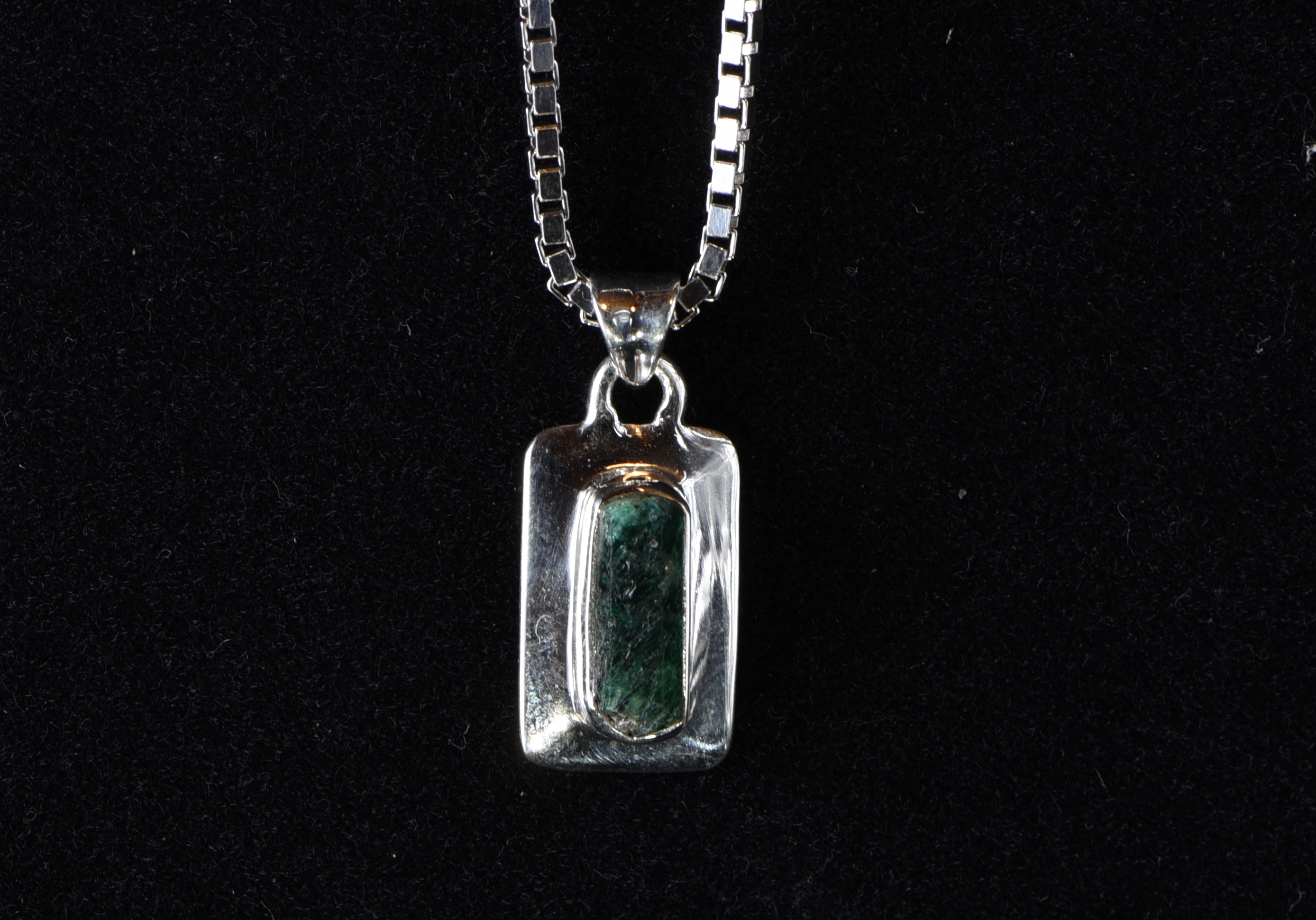 Der Smaragd hat eine gute Qualität, ist naturbelassen und in Silber eingefasst. Der Kristall ist 1,3 cm lang und 0,5 cm dick. Der Stein wurde im Smaragdbergbau im Habachtal (Bramberg, Salzburg, Österreich) gefunden.