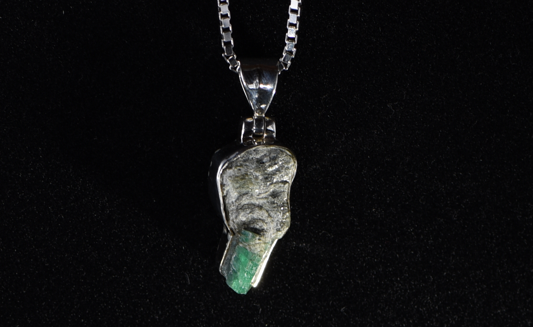 Der Smaragd sitzt im Talk-Schiefer-Gestein. Die Kristallgröße beträgt 9 mm. Der Smaragd wurde im Smaragdbergbau im Habachtal (Bramberg, Salzburg, Österreich) gefunden und in Silber eingefasst (Randfassung mit einer hinten geschlossenen Silberplatte).
