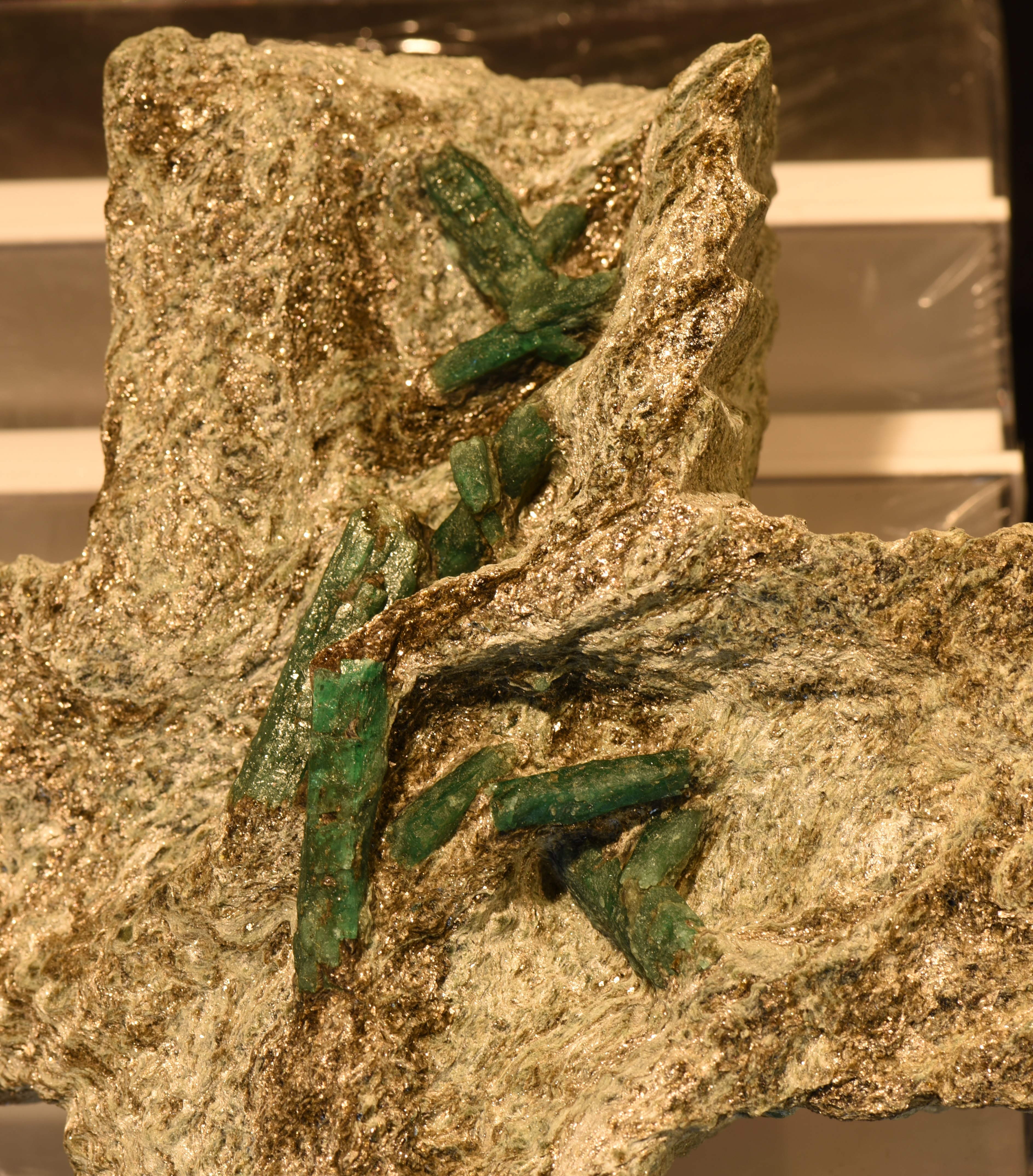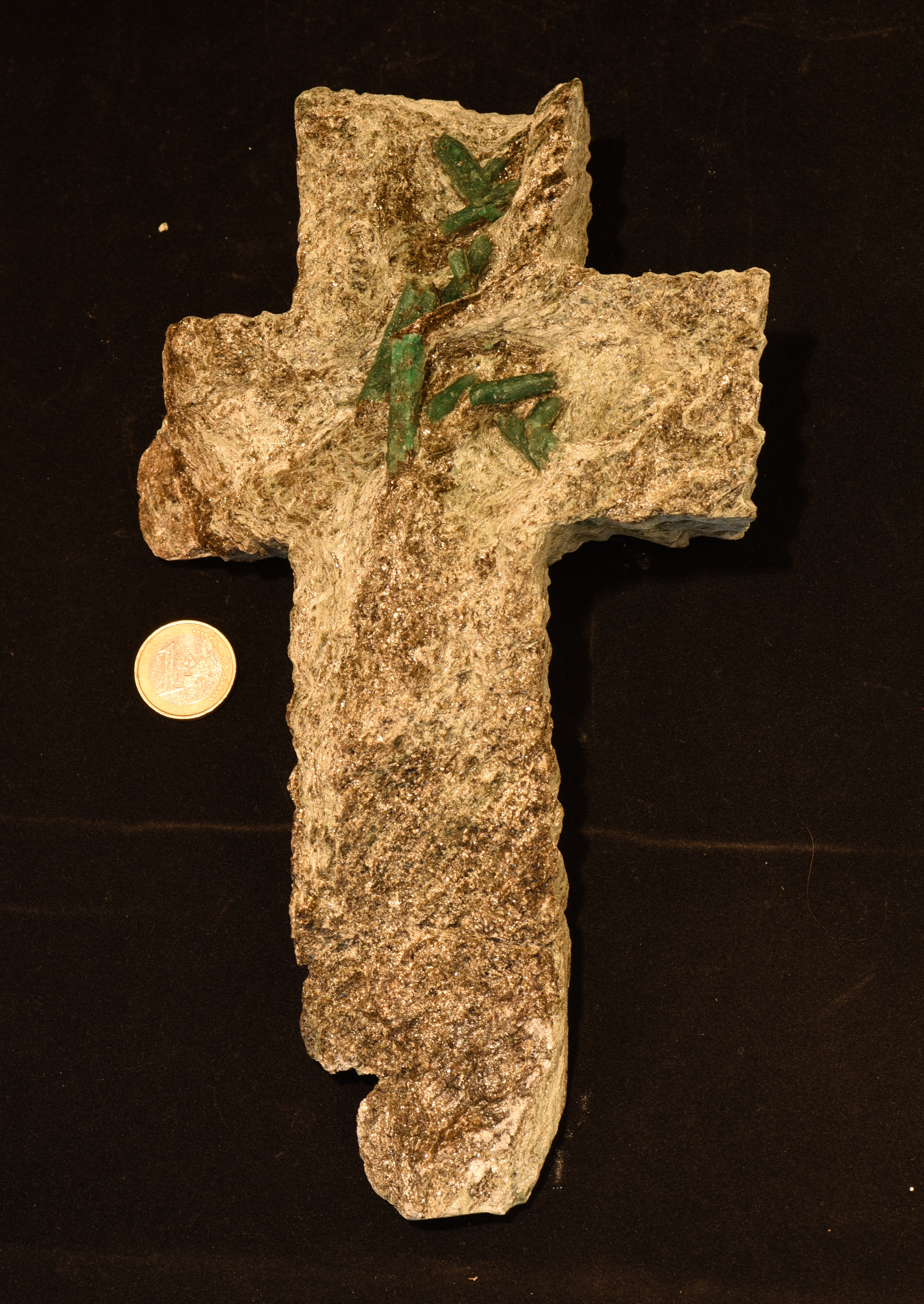 Ein Kunstwerk aus dem Habachtal! Die Qualität der Smaragde spricht hier für sich: die Farbe sowie die Größe ist unglaublich! Der längste Smaragd misst sagenhafte 3,5 cm und ist über einen Zentimeter dick! Der Sockel des Steines ist nicht fix verbaut - die Stufe lässt sich also herausnehmen. Das Kreuz ist ohne Sockel 25 cm hoch und 13,5 cm breit. Sowohl die Smaragdstufe als auch der Aktinolithsockel wurden in der Smaragdmine im Habachtal (Bramberg, Salzburg, Österreich) gefunden.