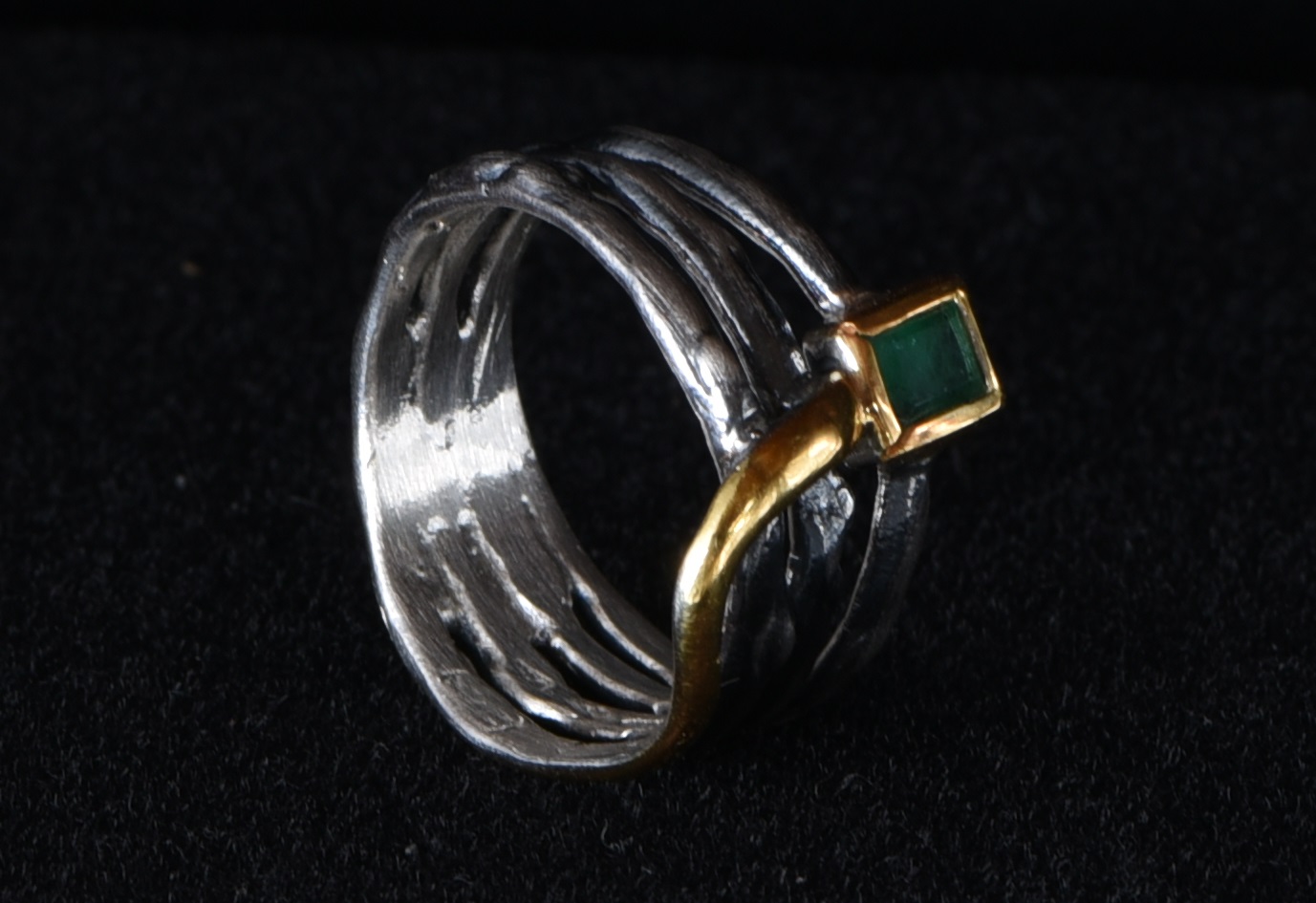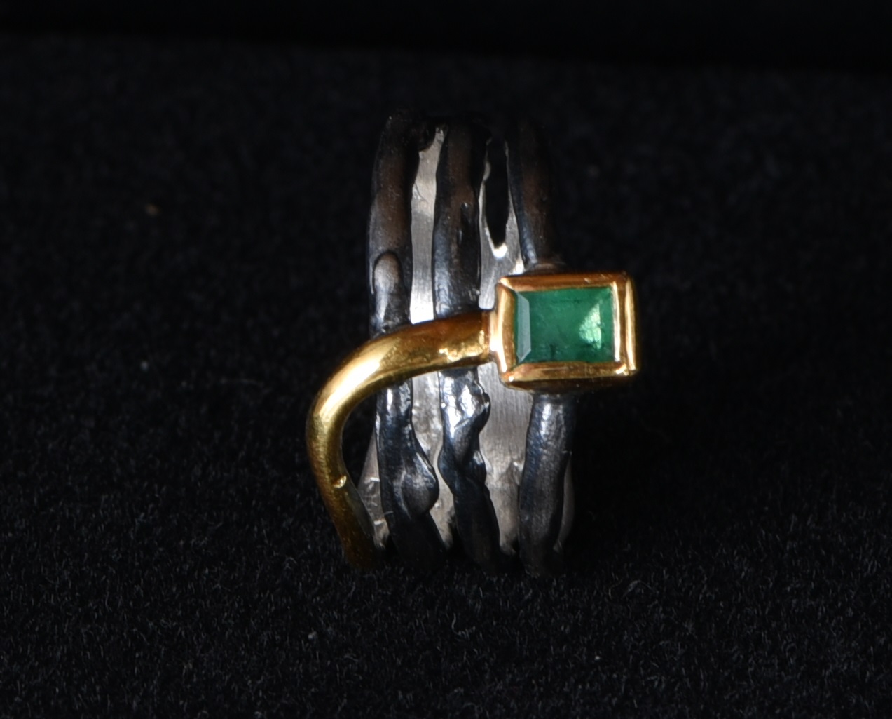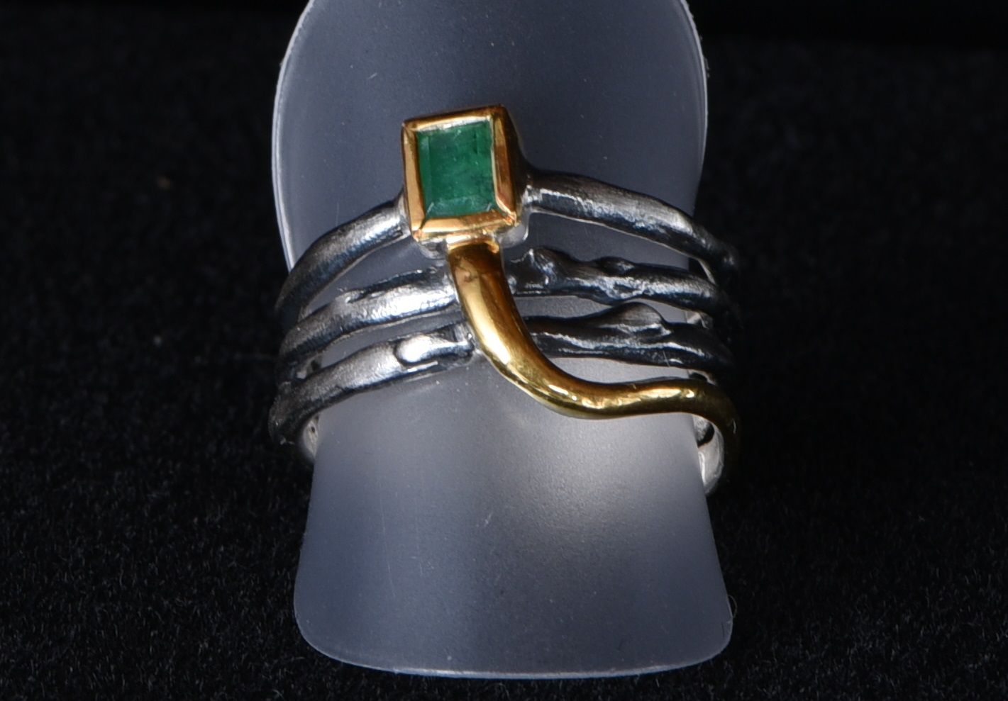 Ein facettierter Smaragd mit einer Größe von 4 mm x 5 mm wurde in einen Silberring eingefasst. Der Stein hat eine sehr gute Qualität und ein helles, grünes leuchten. Das Silber ist teilweise geschwärzt und vergoldet. Der Smaragd wurde im Smaragdbergbau im Habachtal (Bramberg, Salzburg, Österreich) gefunden.
