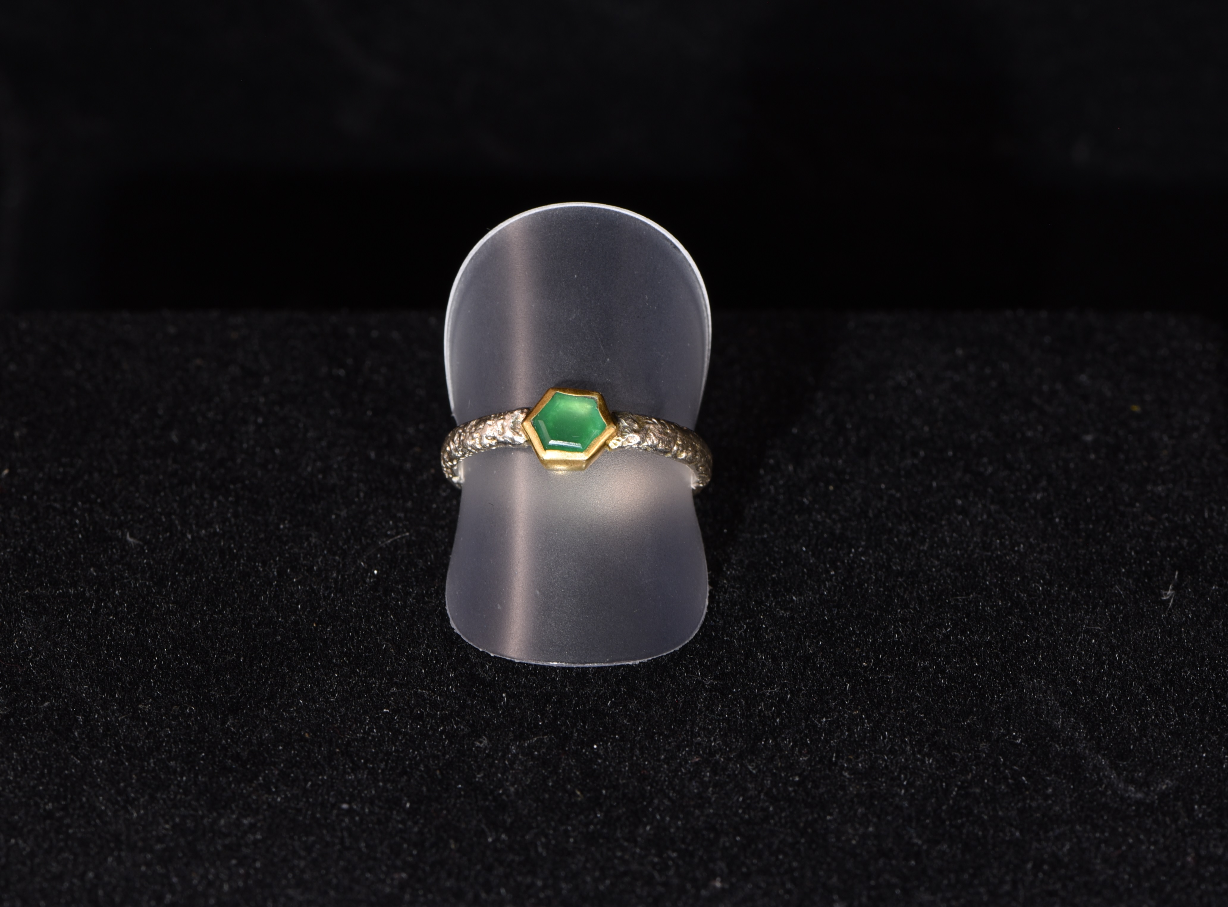 Ein facettierter Smaragd mit einer Größe von 5 mm x 6 mm mit Top-Qualität und einem unglaublichen Leuchten wurde in einen Silberring eingefasst. Der Silberring ist teilweise geschwärzt und vergoldet. Der Smaragd wurde im Smaragdbergbau im Habachtal (Bramberg, Salzburg, Österreich) gefunden.