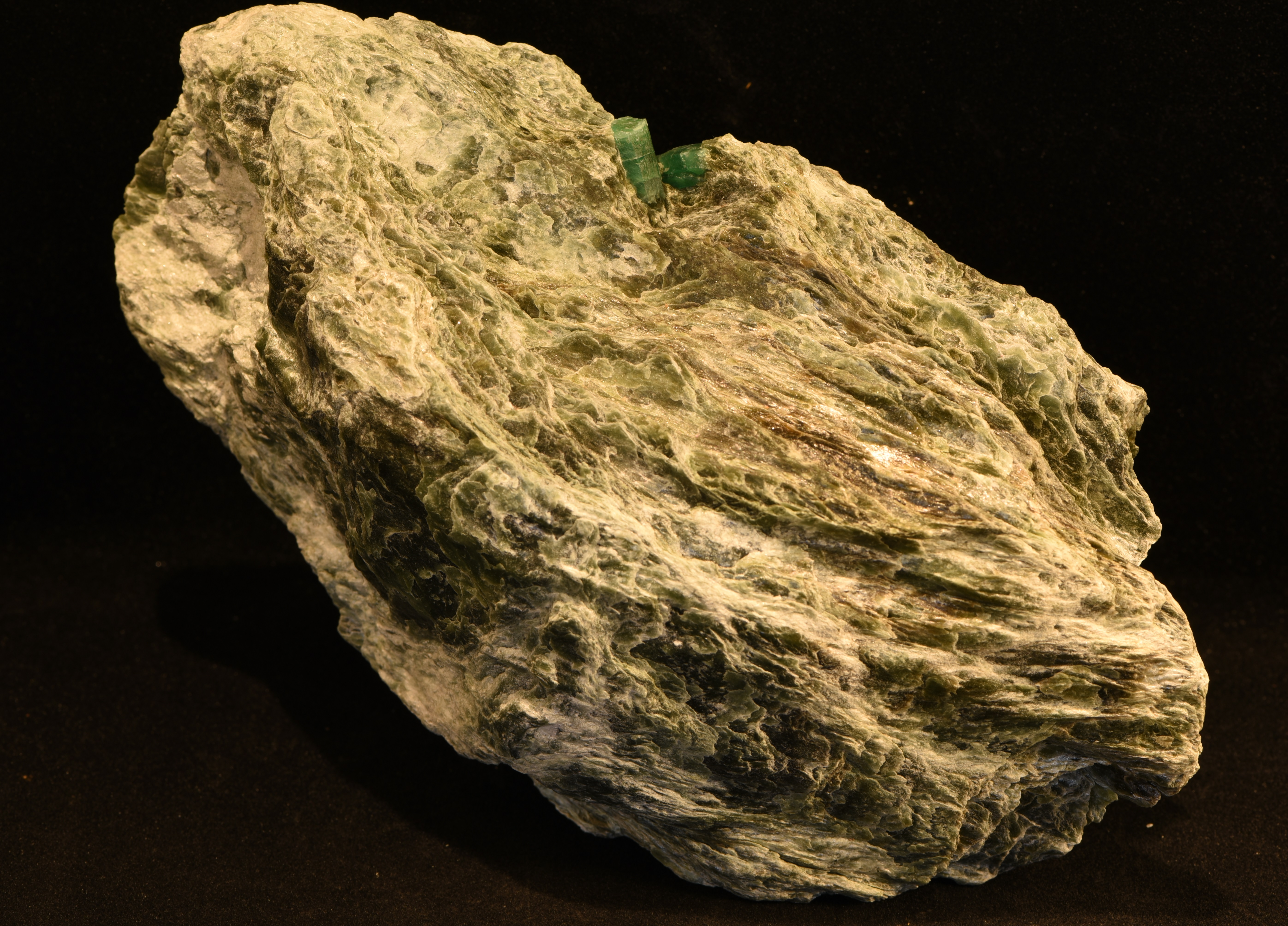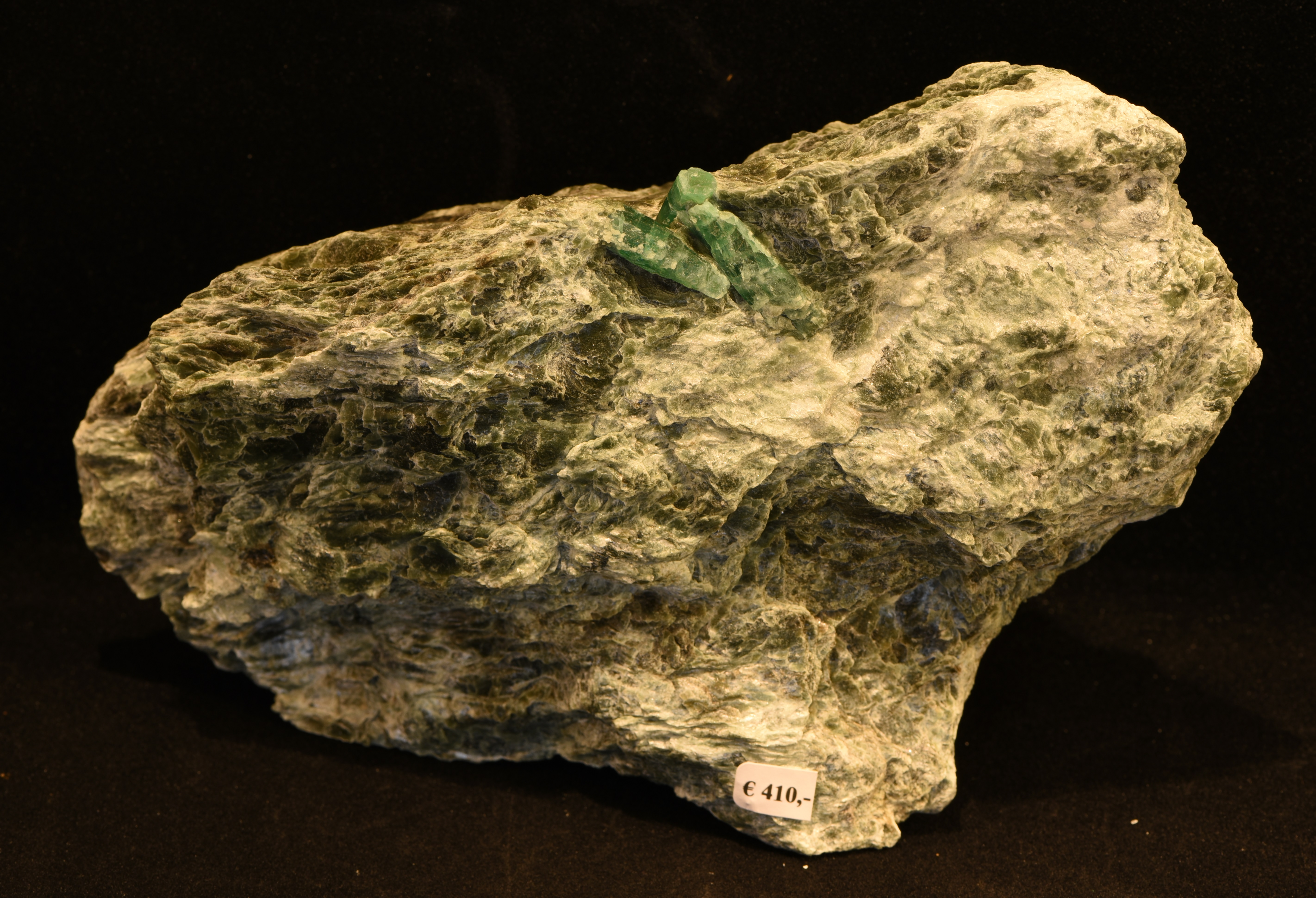 3 Smaragde sitzen auf einer großen Stufe (20 cm x 12 cm) - der längste Smaragd misst sagenhafte 2,5 cm.