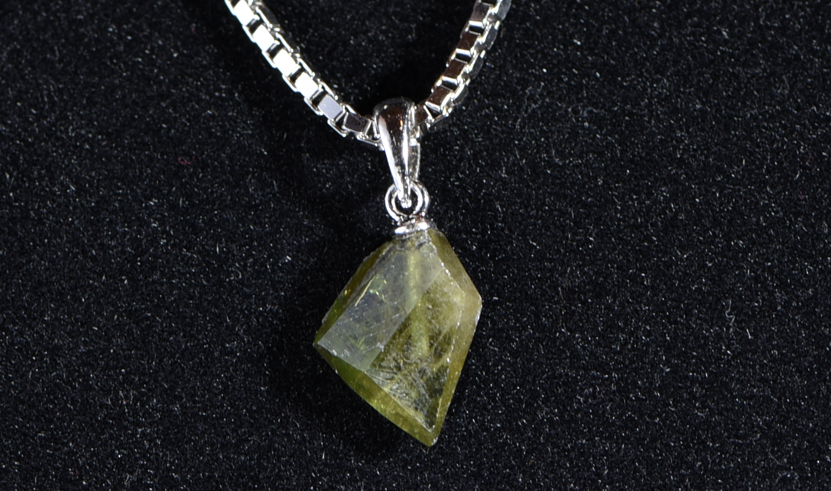 Der Titanit-Kristall ist mit einem Silberstift an einer Öse befestigt. Der Stein wurde im Felbertal bei Mittersill (Salzburg, Österreich) gefunden.
