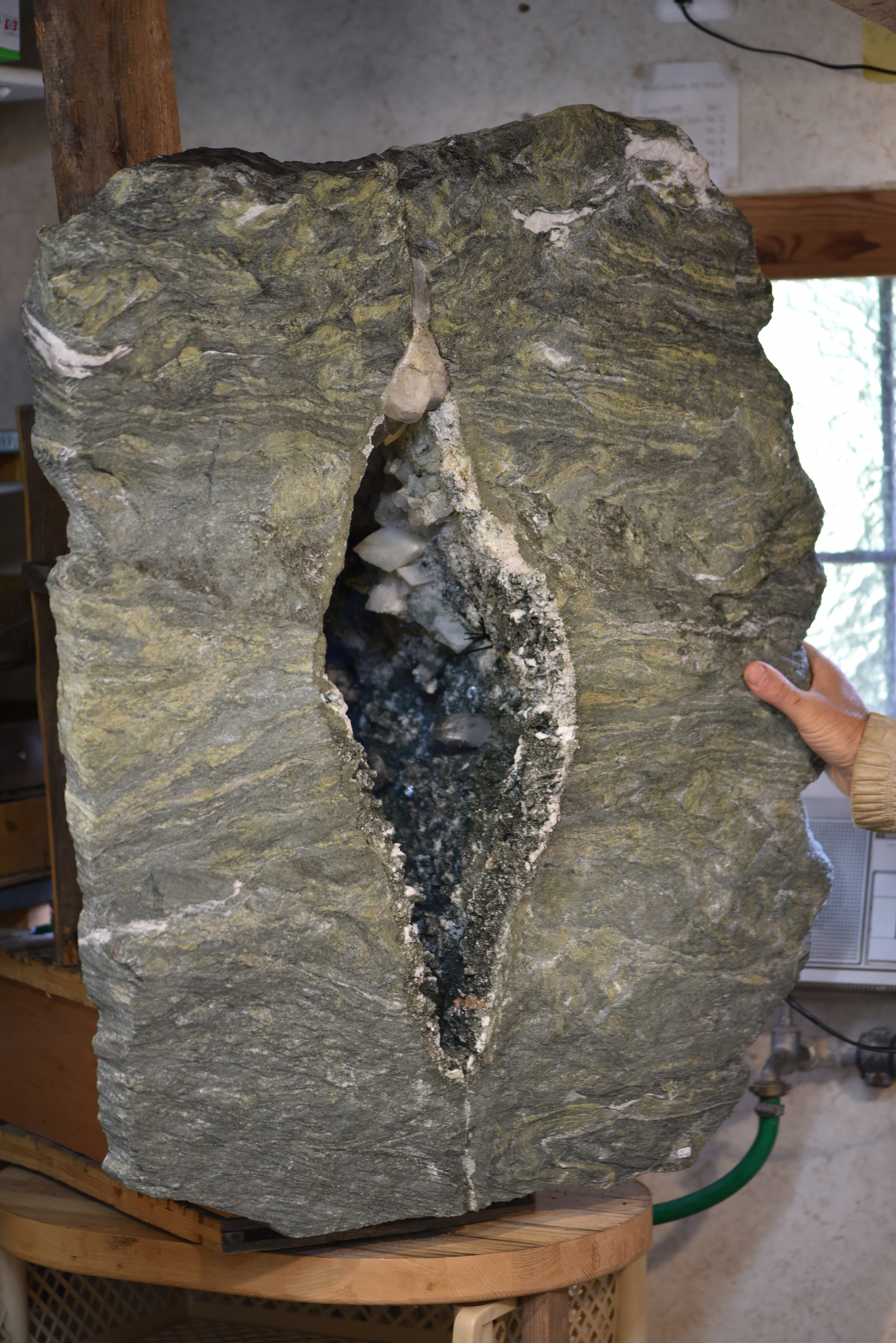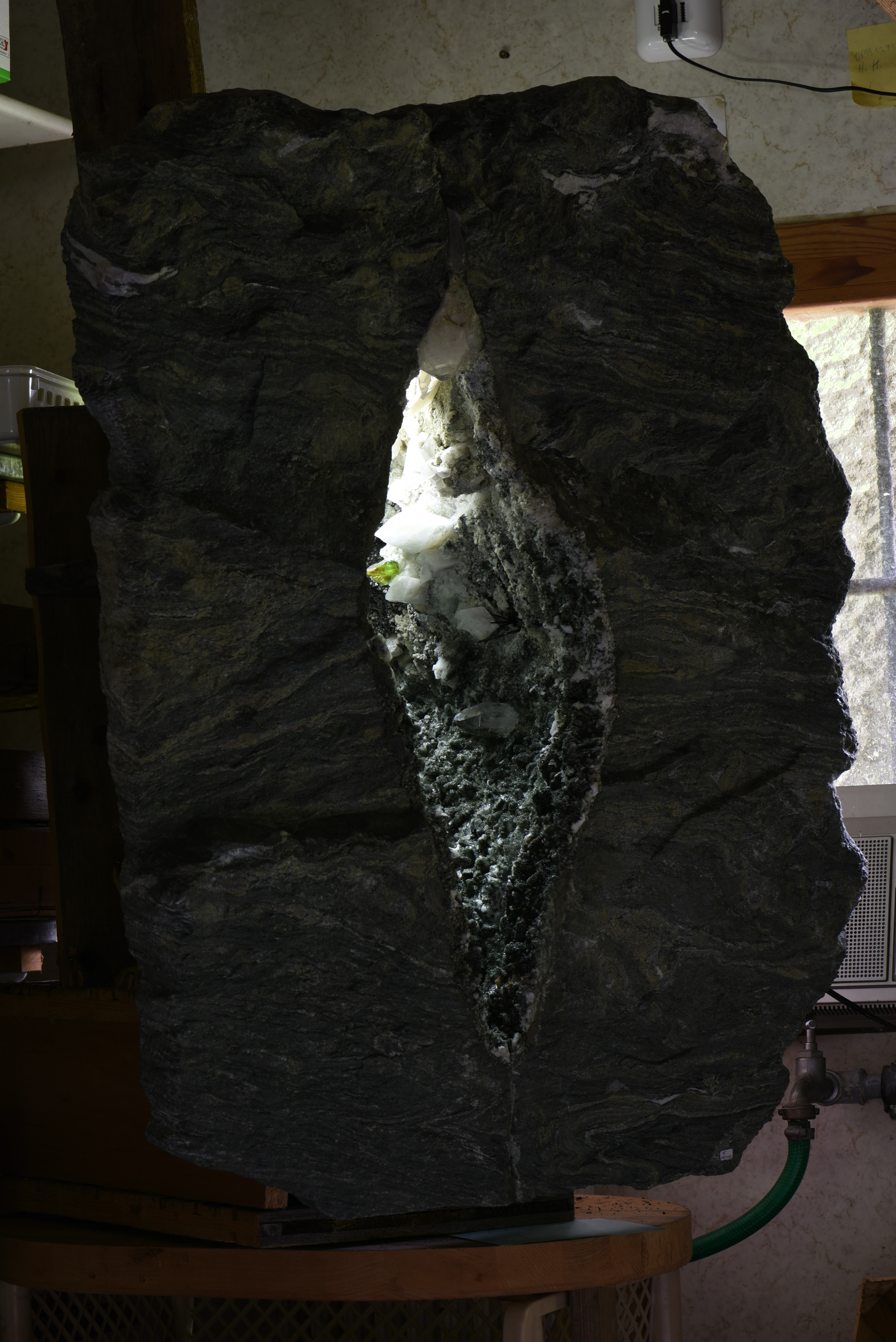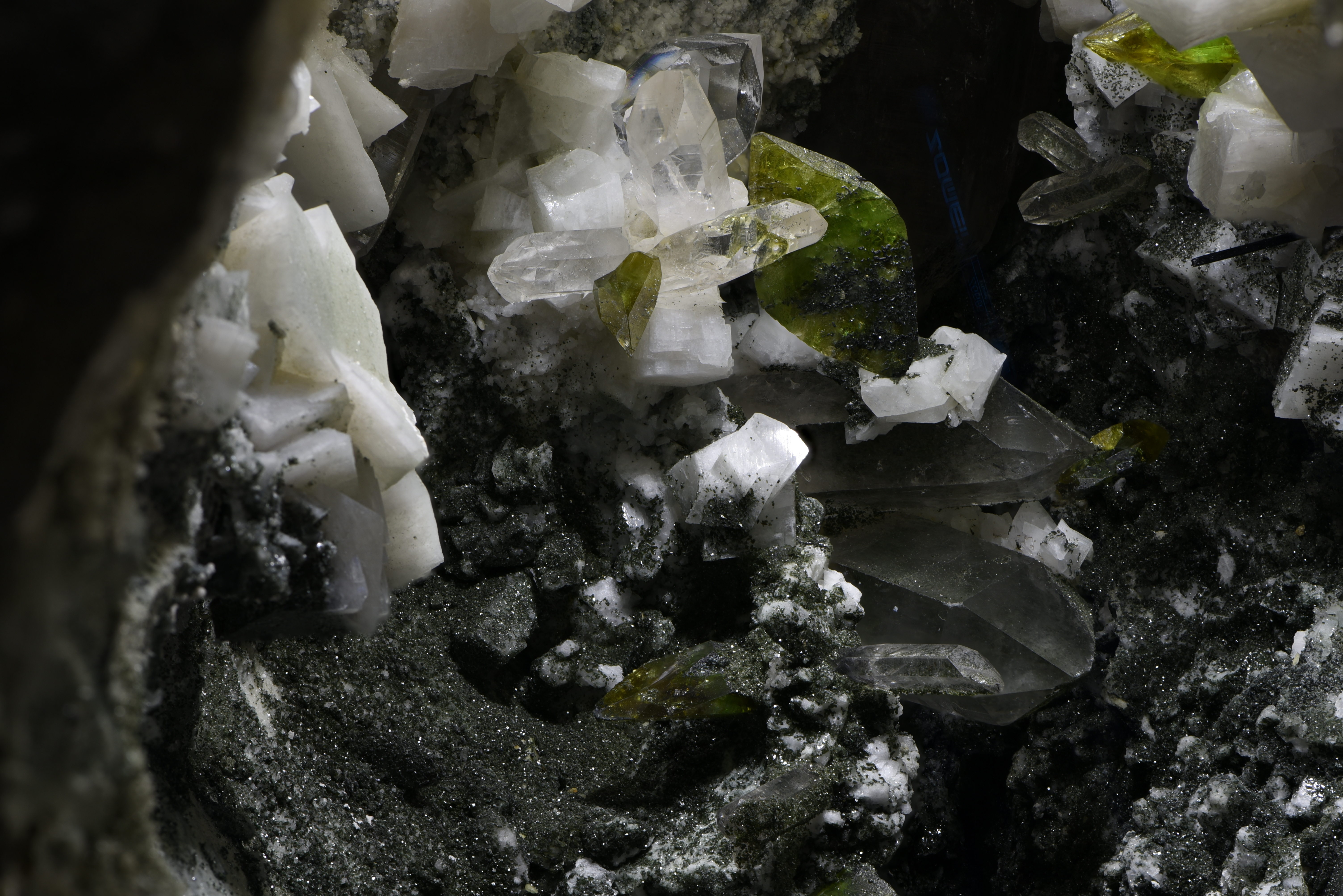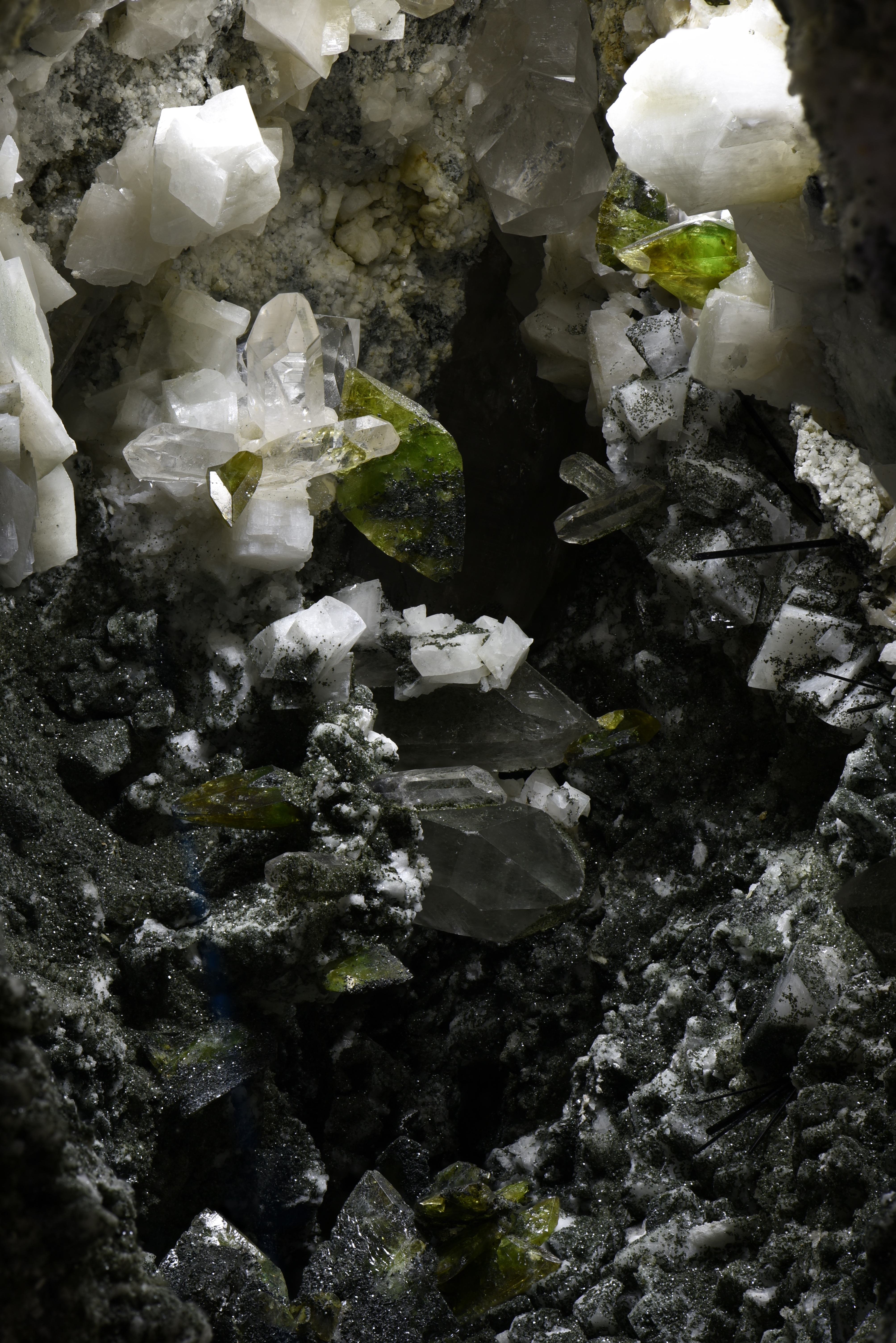 The entire cave content was found at Wageralm in Felbertal (Mittersill, Salzburg, Austria). The cave contains white adular, black, granular chlorite, black tourmaline needles, green-yellow titanites and clear rock crystals.