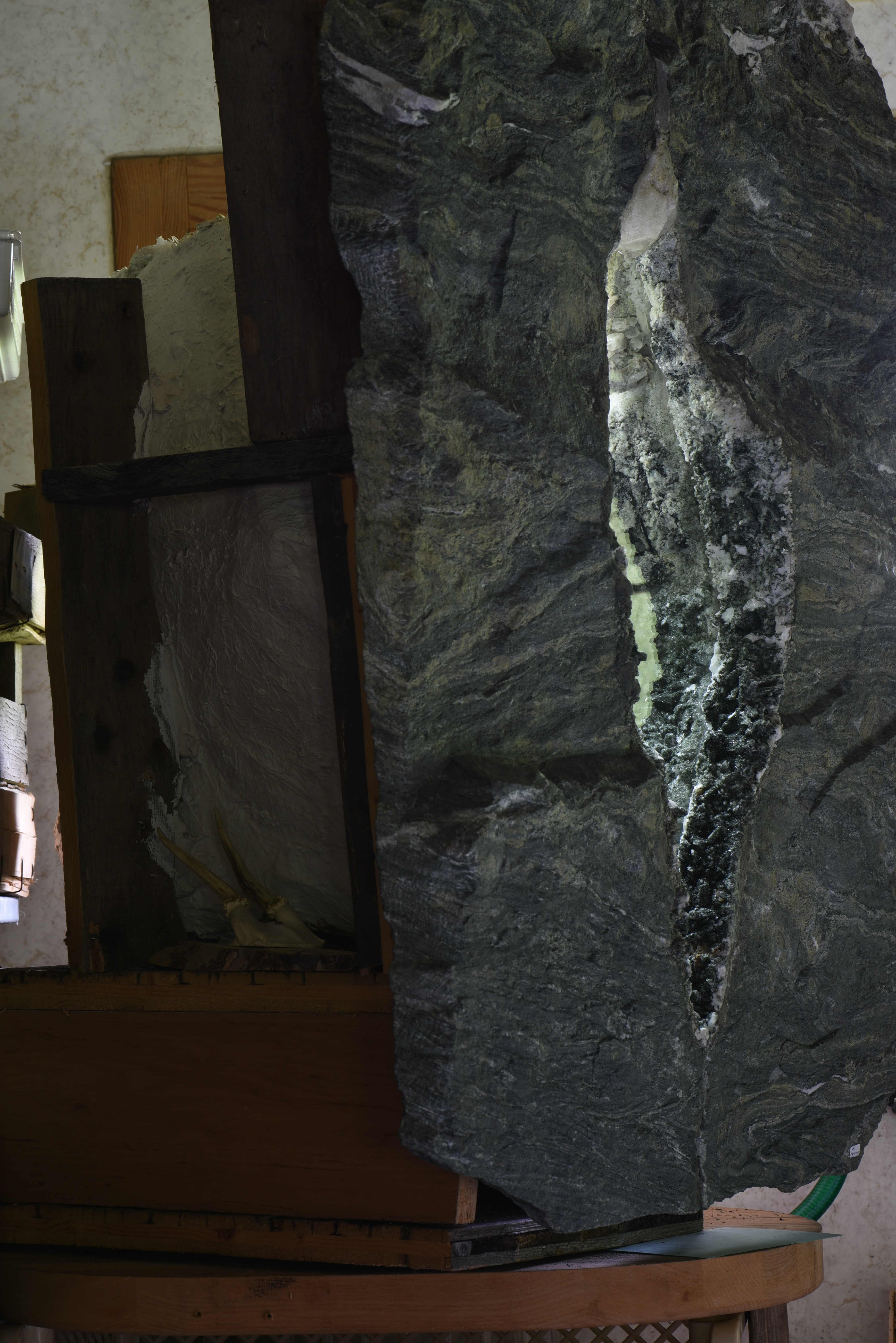 The cave consists of two parts - The frontside is a big green slate plate, which protrudes about 6-7 cm from the wall - this creates a nice conclusion to the actual cave. The frontside with the glare-free glass plate is about 87 cm tall and 70 cm broad.